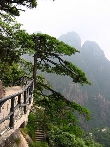 谁说过不要吃饱饭爬山来着?简直是真理啊!肚子里多装了一碗面感觉腿上像灌了十斤铅,步步为艰啊。还好,向上爬高20分钟左右就进入了西海岸,3000米的平缓栈道走起来毫无累意,网上人说最美的西海岸也许是今天没有云海的缘故,景色丝毫没有打动我的脆弱神经。旅行团的导游带着游客到猴子献宝处远路返回了,我们继续前行,跨过一个三清宫的维修告示,没走多久就到了三清宫。