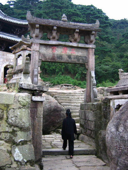 背对三清宫,前方有两条小路,走右边一侧的路没几步就见路边立着“詹碧云墓”的石碑,沿着小路继续前行,不远处有一个岔道,依旧走右边的小路,穿过丛林,来到一小片空地,一个看上去满古老的石龛矗在路旁,里面有好几个身着官服相貌模糊的小石人,石龛上刻着“纠察府”三个蹩脚的字,一看就像是后人补刻上去的。过了“纠察府”,还是走上右边的石阶路,又来到一处建筑,环顾四周没见说明,我们始终没有猜出这是何处,仅清楚的记得路边蹲着一个石雕动物,貌似老虎,也许这就是龙虎殿?不得而知。继续前行经过了九天应元府后多是平缓的栈道,应该是离开了道教文化的三清宫景区,进入东海岸景区了。