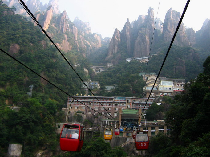 8:00多到达索道站【45元】,跳上缆车,开始居高临下的俯瞰。缆车里很是闷热,我不得不将脑袋深处窗外。向下望,曾走过的山路依旧少见游人,仅有零星几个挑夫用扁担扛着货物一步一个脚印的向上耐心攀登着。