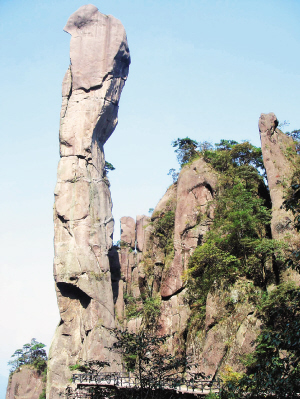 栈道依山盘旋,顺山势蜿蜒,巍巍壮观,令人叹为观止。 那天一早我们上山,坐缆车经过40分钟到达了山顶。往下观望已是一片茫茫云海,几个山尖露出来,仿如海上的小岛。云雾缭绕,青山苍黛,已顿觉美不胜收,而且近处是洁净无比,几乎所有的人都发出一片惊呼,兴奋不已。 三清山最为壮观的是那长约8公里、平均海拔1600米的东西海岸高空栈道,其长度、高度以及险峻程度均为全国第一。栈道建在深不见底的悬崖峭壁上,依山盘旋,顺山势蜿蜒,巍巍壮观,令人叹为观止。行走在栈道上,脚下是茫茫云海和千山万壑,西海岸的栈道和云是一组不可分割的整体,没有栈道无法观云,而没有云彩,栈道也就只有显示一种单一的险,没有边观云边体验险绝那种既飘飘欲仙又忐忑小心的心情。栈道之险在于其下临深渊,凌空欲坠。险要处仅可容身,或90度急转,如游龙一般盘绕在山腰。 万寿园内奇峰秀松均赋永恒万寿之意,道法自然,天人合一。奇峰、异石、花木、云海;上山、下山、跨桥、过溪。三清山登山中最累景色最为集中的一段就在南清园。南清园范围极大,该区以奇峰怪石为主,配以杜鹃林,三清山最著名的山景“司春女神”、“巨蟒出山”及有着绵延数百亩百年古杜鹃的“杜鹃谷”。我们走在南清园的山林里,心情如鸟儿一般,也在雀跃和歌唱。四周千峰竞秀、万木葱茏,自然原来是如此这样的壮丽! 趁体力尚好,我们一鼓作气地攀登玉京峰。玉京峰海拔1820米,是三清山最高峰。与玉华峰、玉虚峰呈三足鼎立之势,合称为“三清三峰”。玉京峰登顶之路不算陡峭,我们从跨鹤桥附近用了大约半小时就爬到了峰顶,感觉强度一般。玉京极顶,风大雨骤,四周茫茫一片。据说登上玉京峰,可以看到直落千丈壁立万仞的飞仙谷和王母谷,但我们此时什么也看不到。 ■旅游提醒 三清山景区很大,即使坐缆车上山后,也要走很长的路。所以建议不是很善于爬山的旅客先是坐缆车上山比较好,俯瞰大山也是别有情趣。 |