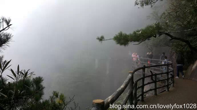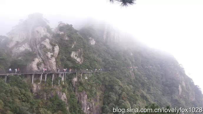 说句良心话,攀登三清山的路是很好的。建筑在山崖上的栈道够宽够平的,它绕着山体螺旋式上升,远远望去像画家笔下的一朵朵硕大的彩云,它与忽近忽远、忽浓忽淡的天然云雾融为一体,给了我一种力量,像是彩云伴我上清峰。