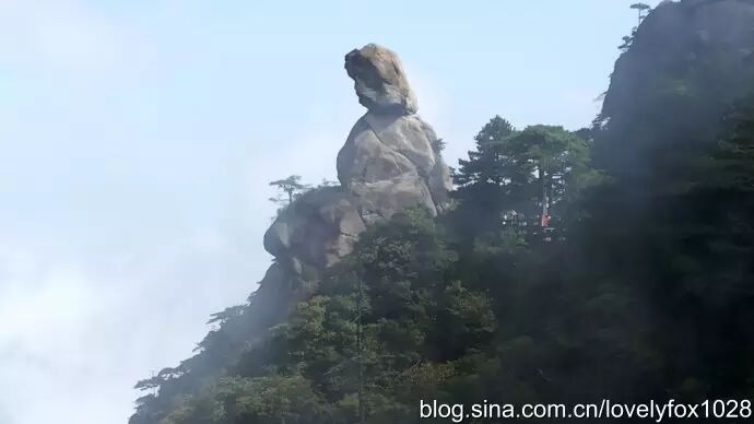 三清山上由两块巨型花岗岩组成的一尊天然女神塑像,隐身苍松翠鹃之中,脸带幸福微笑,面对阳刚俊美的巨蟒出山,风情万种。