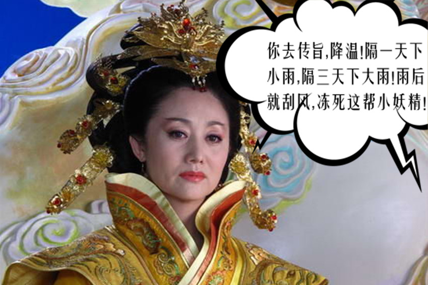 王母怒 :“你去传旨,降温!!隔一天下小雨,隔三天下大雨!!!雨后就刮风,冻死这帮狐狸精!!!”