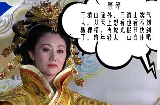 王母:“等等,三清山除外,三清山雾气大,从天上想看也看不到狐狸精,再说光棍节快到了,给年轻人一点自由吧! ”