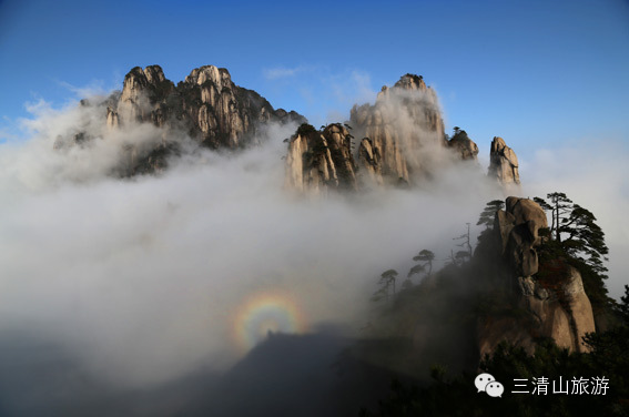 受冷空气影响,三清山出现今冬以来最大强降雨。从11月29日下午开始,三清山出现大到暴雨天气。12月1日清晨,雨后的三清山大雾弥漫。7点44分,突然大雾散开,站在琼台边上的观景台上,只见玉京峰白皑皑的云雾,时而如天幕下降,银河倒泻,时而象长霓下壑,白龙串谷,时而象瀑布凌空而降,滔滔不绝。碧绿的山脊在流动云雾的映衬下,时而象大海中的礁石,顶风逐浪,时而象飘荡在大海中的群舟,千帆竟发。最为壮观的是8点31分,对面山峰惊现的“佛光”奇观,令常来三清山创作的摄影爱好者也叫绝。佛光前后大约持续3分钟。