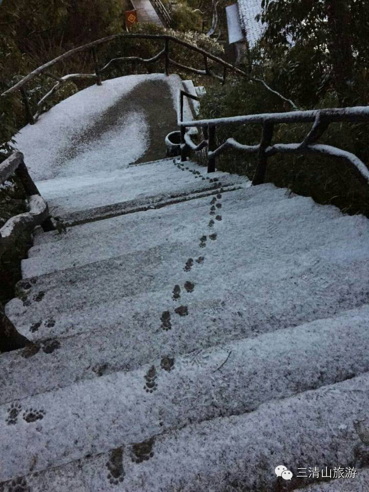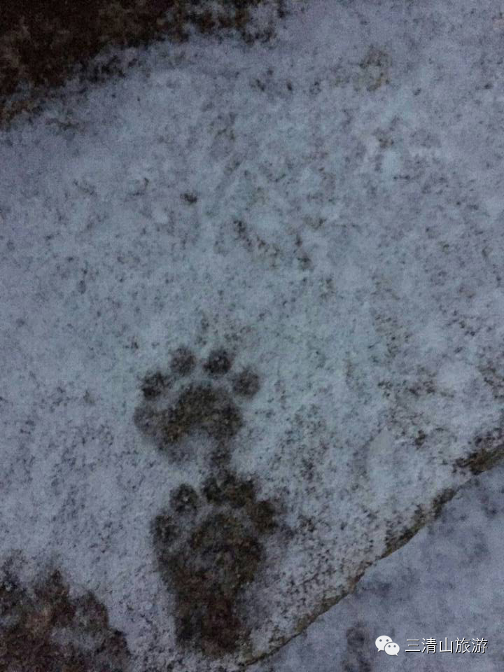 起早拍雪景日出的摄友注意到,女神观景平台往杜鹃林方向游步道上薄薄的积雪留下有一串串清晰的脚印,还有比我们更早的同行摄友呀?奇怪,脚印齐整,还是爪印!呵呵,我们可以探寻发现怪兽了,摄友你一言我一语,都出来凑热闹了。