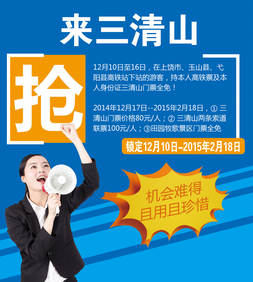 12月10日至16日,在上饶市、玉山县、弋阳县高铁站下站的游客,持本人高铁票及本人身份证三清山门票全免!紧接着,2014年12月17日--2015年2月18日,① 三清山门票价格80元/人;② 三清山两条索道联票100元/人;③田园牧歌景区门票全免,真的很“大气”。