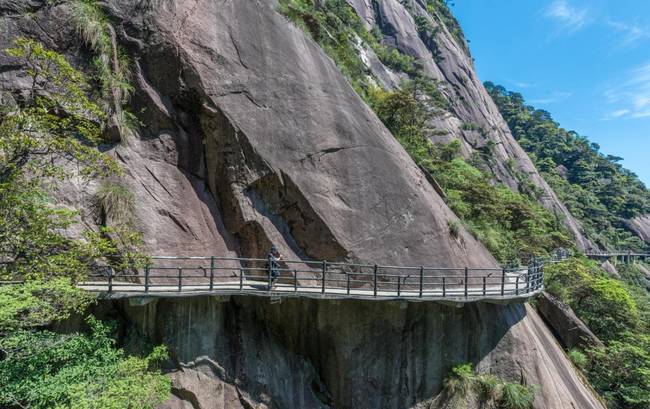 三清山的高空栈道,是全国海拔最高,长度最长的栈道。栈道平均海拔1600米,全部是在悬崖绝壁上靠人工修建而成。沿着栈道前行,身边尽是美景,山上的天气多变,一片云雾飘来,山峰就若隐若现。一边是悬崖绝壁和原始森林,一边是幽深的峡谷,远处是连绵群山,简直叫绝。