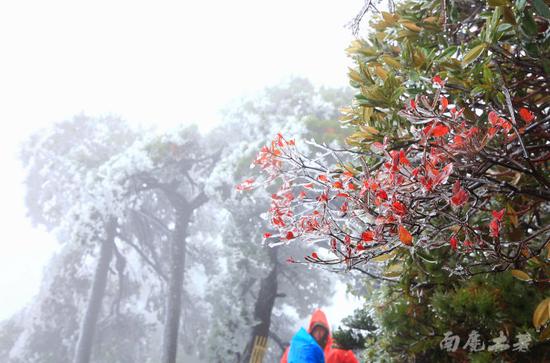 一路向上风雨大作,北纬30度的奇特纬线让这个秋天的三清山充满神奇。是啊,你不觉得奇怪吗?走着走着,眼前居然出现了雾凇奇观,一颗颗苍劲的松树在风雨中缀满了晶莹剔透的冰花,翠绿的松叶隐约可现。