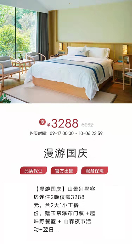 漫游国庆:三清山雷迪森酒店山景别墅客房连住2晚仅需3288元,含2大1小正餐一份,赠玉帘瀑布门票 +趣味野餐篮 + 山森夜市活动+翌日早餐+首日MINI吧,至少提前1天预约噢,联系电话:18079312866