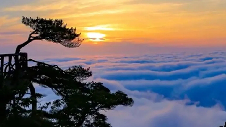 站在山巅向东方眺望,红彤彤的朝阳带着万丈霞光照拂大地,连接天际的云海也被染成红色、金色,氤氲在山腰间的金色云海宛如一条丝绸将群山连接在一起。到了中午,云海不但没有散去,更加肆意流动山间,来山游客纷纷拿起相机手机记录下此刻美景。