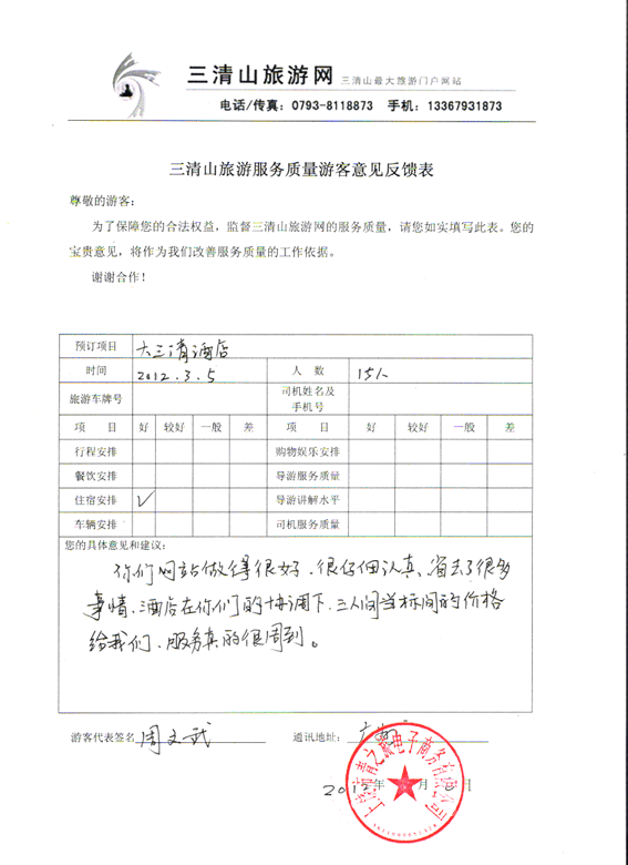 3月5日广州周先生一行15人反馈:对行程、住宿、餐饮满意